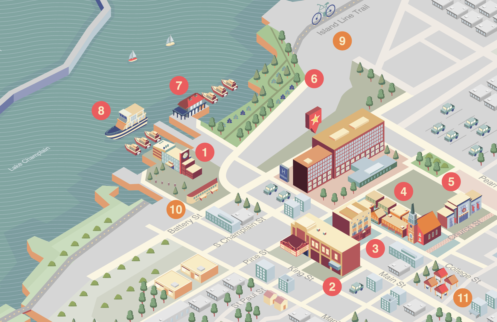 BRAINtrust Marketing + Communications commissioned me to create an illustrated map for the Burlington Hilton Hotels & Resorts, guiding travelers to the hotel's nearby famous attractions.